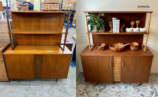 I have never seen a buffet with an open hutch like this and it is one of the most spectacular pieces I’ve ever worked on! The combination of woods and the shape of it is truly incredible 🥰