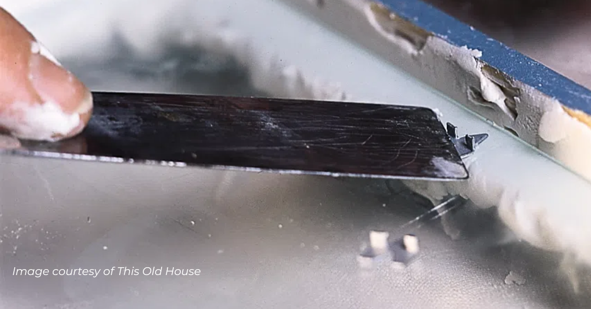 - By having the metal edge of the putty knife on this ledge, the glass is protected from getting scratched.