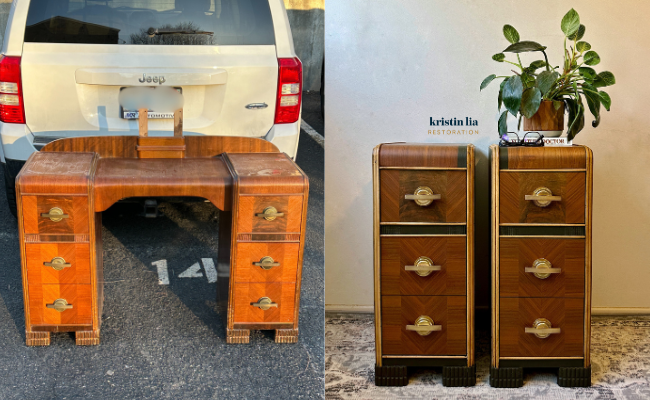 When I saw this Art Deco vanity on the curb when I was walking Milo & Jack, I knew it was my perfect opportunity to try my hand at converting them into nightstands. I hadn’t attempted it before and knowing that it was free, I crossed my fingers the whole way home that it wouldn’t be picked up by someone else before I got back 🤞🏼