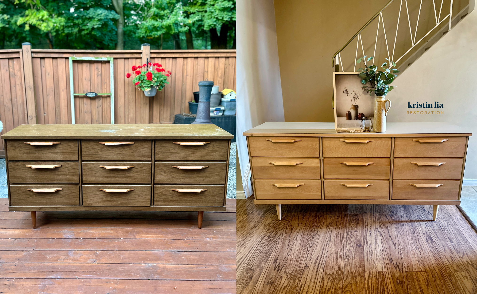 Another beauty of a Mid Century Modern 9-drawer dresser that I picked up from Lyn Jaymes Home! I did the matching chest of drawers and I know it has a laminate frame and wooden drawers. My plan is to paint the frame and sand the drawers.