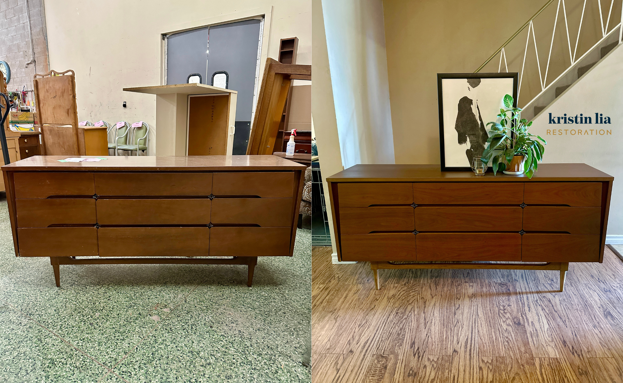 The moment I saw this Mid Century Modern Kroehler 9-drawer dresser, I was in love with how unique it was. The decorative bits, the curved sides of the drawers and the clean design really drew me in.